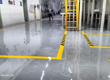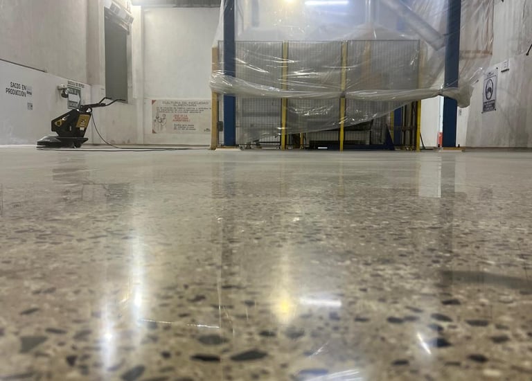 Proceso mecánico de desbaste y pulido del concreto mediante maquinaria especializada y diamantes, sellado con densificadores para crear una superficie ultra lisa, densa y brillante.